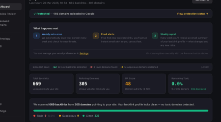 Every website picks up backlinks it didn't ask for — spam networks, link farms, scraper sites. When they cause a Google penalty or tank your rankings, you need to act fast. Disavow.ai scans your backlink profile, classifies every linking domain as clean, suspicious, or toxic using a 4-layer Smart Risk Engine, and generates the exact file Google needs to ignore the bad ones. Toxic domains are grouped into plain-English categories — Spam & Link Farms, Private Blog Networks, Known Spam Patterns, Risky Extensions, and Near-Zero Authority — each showing exactly why it was flagged. No SEO jargon, no black-box scores. Free tier lets you scan and see 15 backlinks. Pro at $39/mo gives you unlimited backlinks, full export, and weekly auto-scans. That's 70% less than Semrush for the same core functionality.