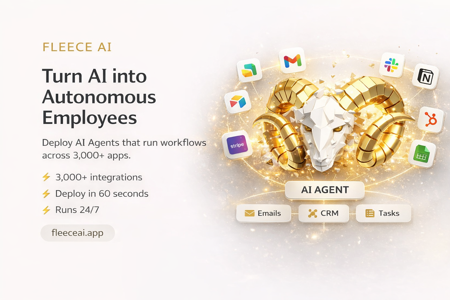 Fleece is an autonomous AI agent platform. Deploy agents that automate workflows 24/7 across 3,000+ integrations. No code, no credit card. Start free.