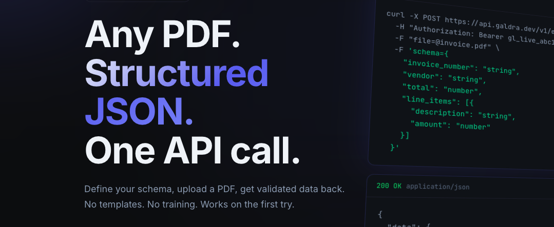 Any PDF. Structured JSON. One API call. Extract structured data from documents with schema-first AI.