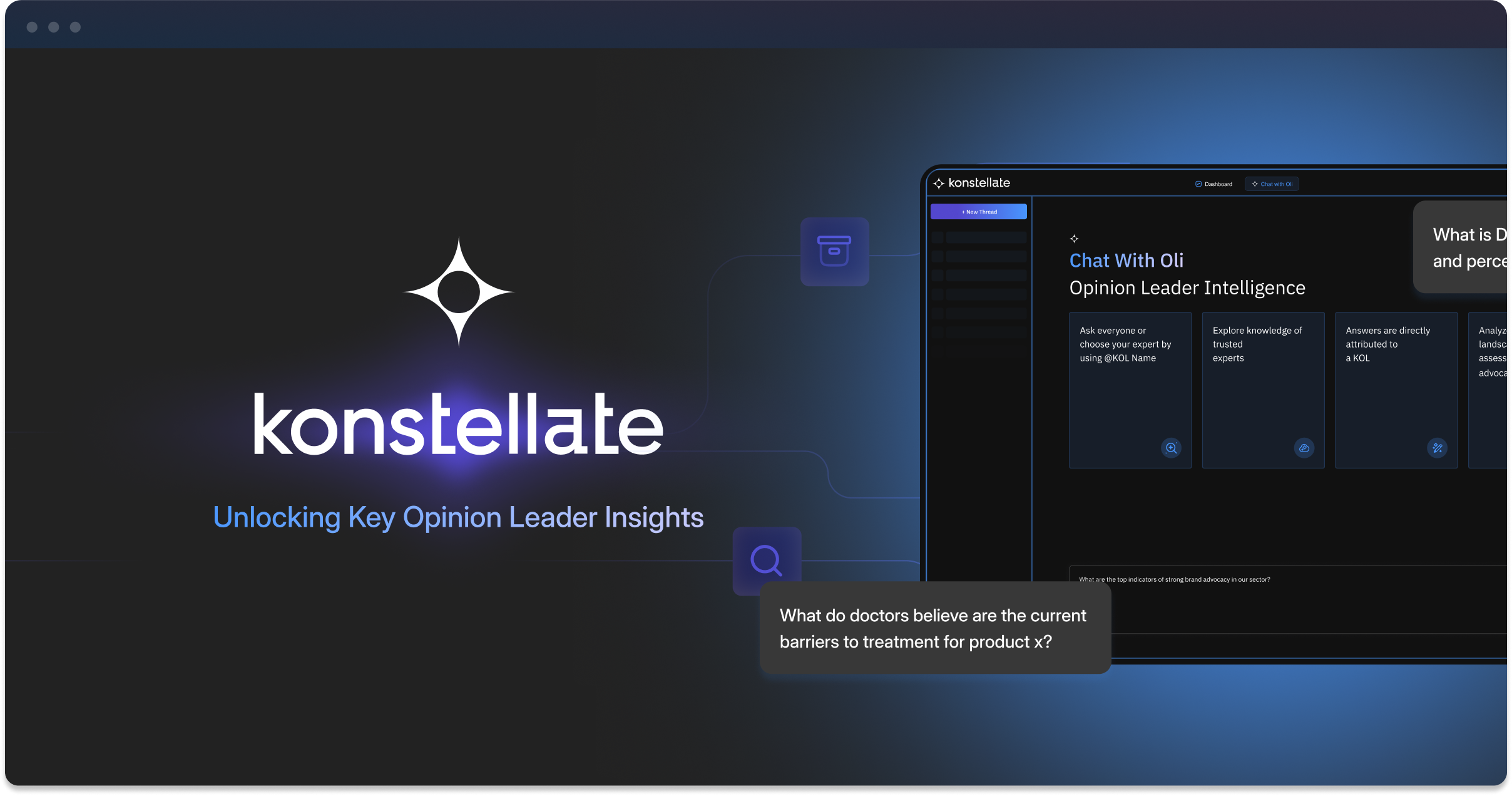 Konstellate provides AI-driven KOL intelligence for pharmaceutical companies. Instead of searching fragmented sources, teams can ask targeted questions and receive attributed insights from verified expert content across publications, conferences, video, and audio.