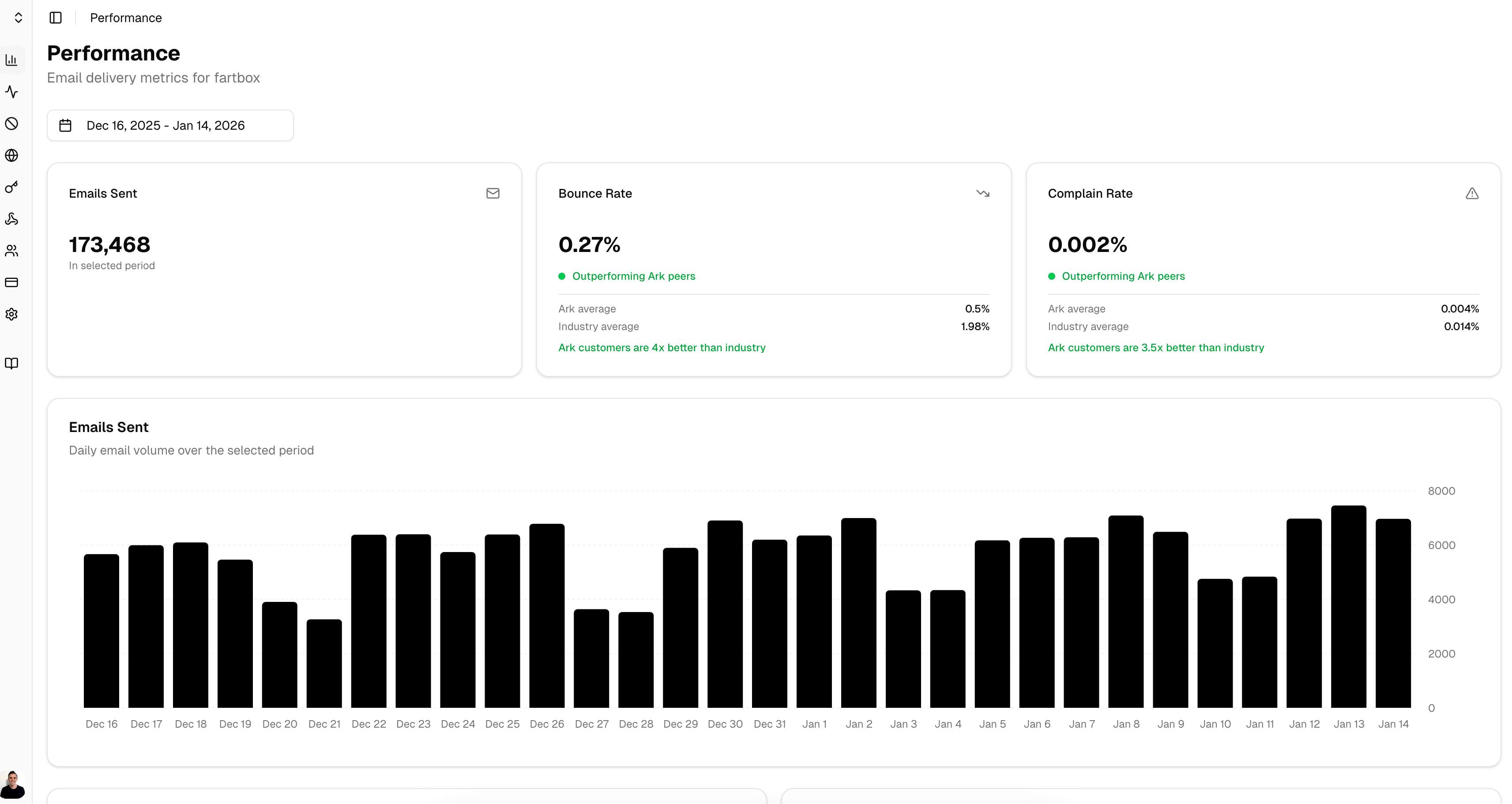 Ark is the email API built for AI-first developers. Native MCP server with 26 tools lets Claude, Cursor, Windsurf, and Claude Code send emails through natural language — no wrapper code needed. AI-readable docs cut token usage by 10x. Integrates seamlessly with your stack: Supabase edge functions, n8n workflows, Vercel serverless, or any automation pipeline. SDKs for Python, Node.js, Ruby, and Go. Full SMTP relay for self-hosted tools like Listmonk, Coolify, and Metabase. 99.9% deliverability. Sub-second delivery. Automatic SPF, DKIM, and DMARC. Real-time webhooks for delivery, opens, clicks, and bounces. Simple pricing: $0.50 per 1,000 emails. No tiers, no enterprise sales calls. Start free with $5 in credits. Built for developers who ship with AI, automate with code, and don't want to think about email infrastructure.
