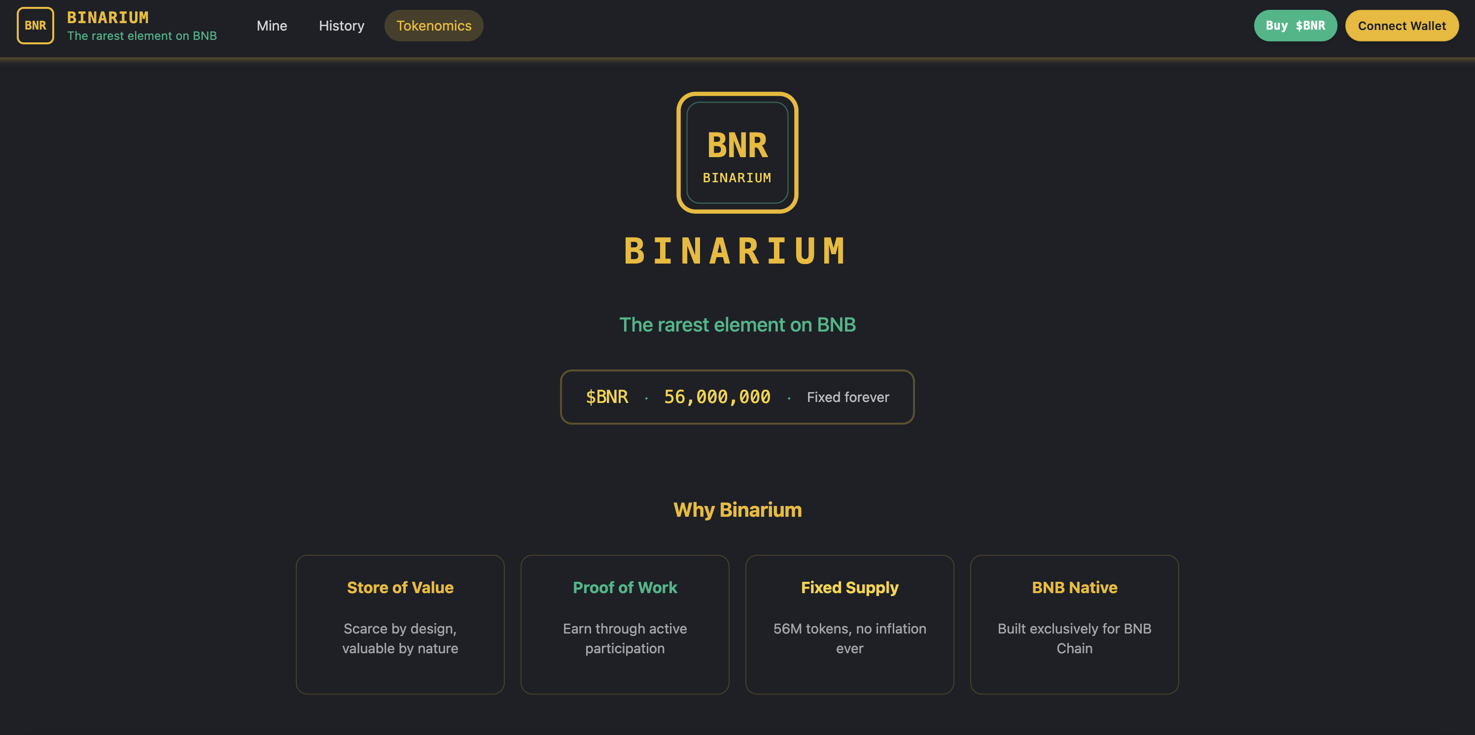 Mine Binarium, the definitive store of value on BNB Chain. On-chain mining with triple rewards: $BNR tokens, native BNB, and BNB Motherlode jackpots. Fixed 56M supply, fair launch, no presale.