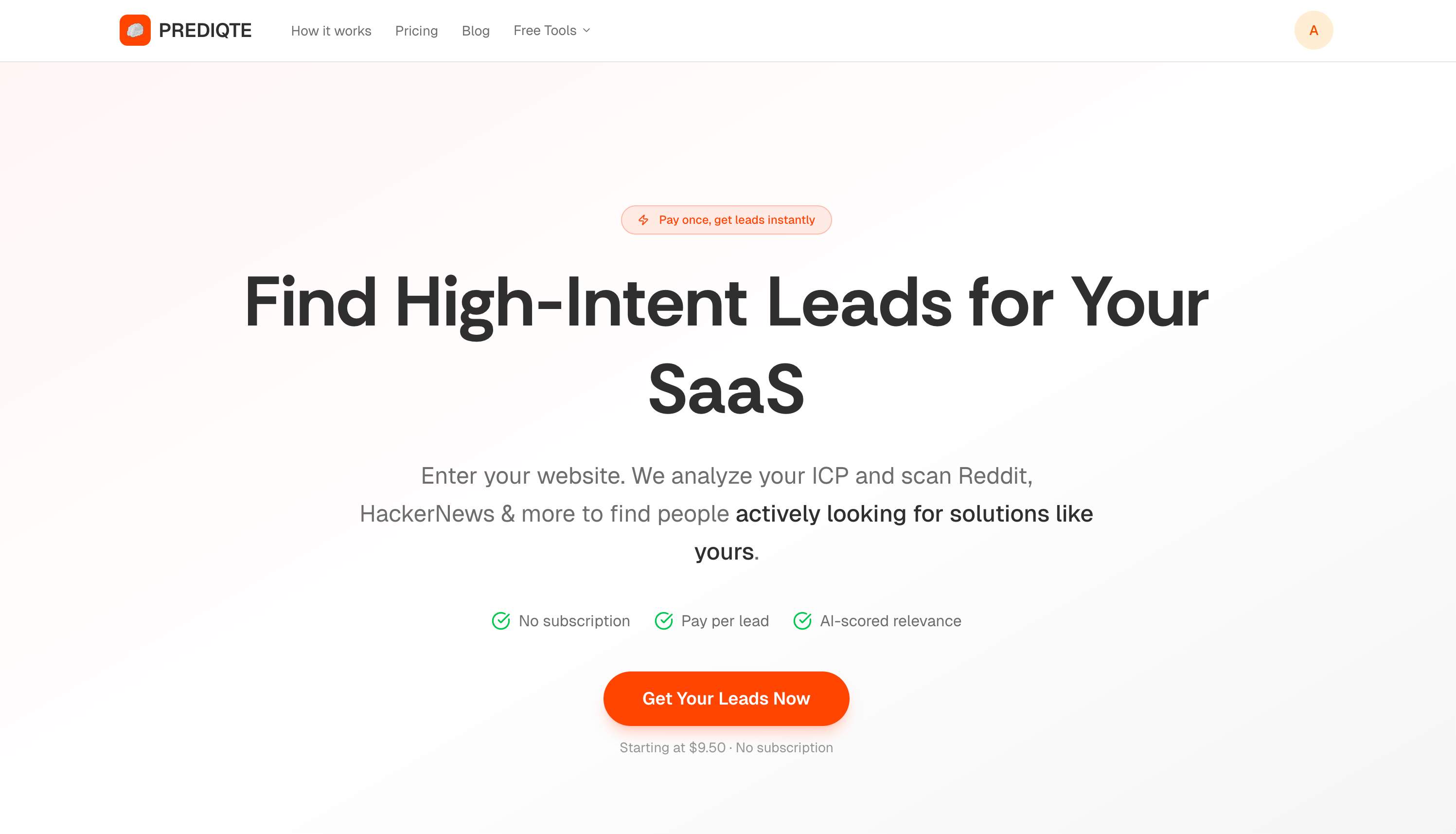 Prediqte helps B2B SaaS founders find high-intent leads without spending hours manually searching forums. Enter your website URL, and our AI analyzes your product to understand your ideal customer profile. Then it scans Reddit, HackerNews, LinkedIn (and more platforms coming soon) to find real conversations where people are asking for exactly what you offer. Each lead comes with a relevance score and an AI-generated explanation of why they match your ICP. Unlike cold lead databases, these are people with genuine buying intent—actively seeking recommendations or complaining about competitors. Get 20-50+ leads per run in under 5 minutes. Pay per run starting at $9.50, no monthly subscription locking you in. Buy runs in bulk for better value.