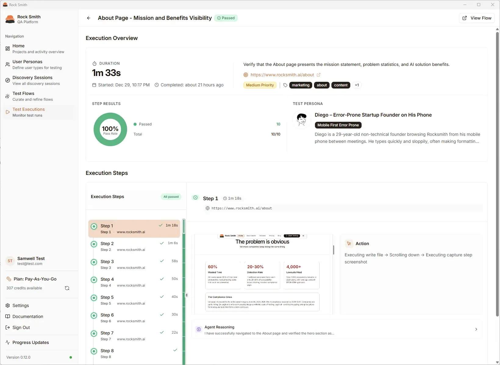 Rock Smith - AI-Powered Black Box QA Testing Rock Smith automates web application testing using autonomous AI agents that see and interact with your app the way real users do. Unlike traditional test automation tools that rely on brittle CSS selectors and XPath expressions, Rock Smith uses semantic element targeting—describing elements by visual appearance and context (like "the blue Submit button below the form") so tests self-heal when your UI changes. How It Works Create reusable test flows in natural language or let our Discovery engine automatically explore your site and generate tests from observed patterns. Key Features • Visual Intelligence – AI agents understand buttons, forms, and modals by appearance, not DOM structure • Edge Case Generation – Automated fuzzing creates 14 scenario types including boundary values, XSS, and injection testing • Test Personas – Simulate different user behaviors, from power users to first-time visitors.