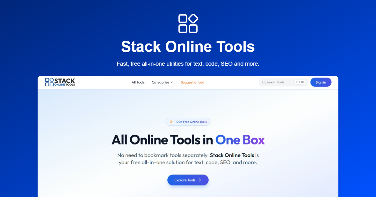 Stack Online Tools offers an extensive collection of over 100 free online utilities designed to enhance productivity and efficiency across various domains. Organized into categories such as text processing (case converter, word counter, diff checker), encoding & security (Base64, hashes, QR codes), data/JSON handling, code and development helpers (formatters, minifiers, regex tester), SEO and marketing tools (meta-tag generator, URL slug creator), and image/media utilities, it brings a wide range of tasks together in one place. Built for speed—with most tools loading in under a second—it emphasizes privacy by handling the majority of processing on the client side and collecting minimal data. No account is required to use the core utilities, commercial use is allowed, and the project is maintained by a team dedicated to making essential online tools accessible to everyone.